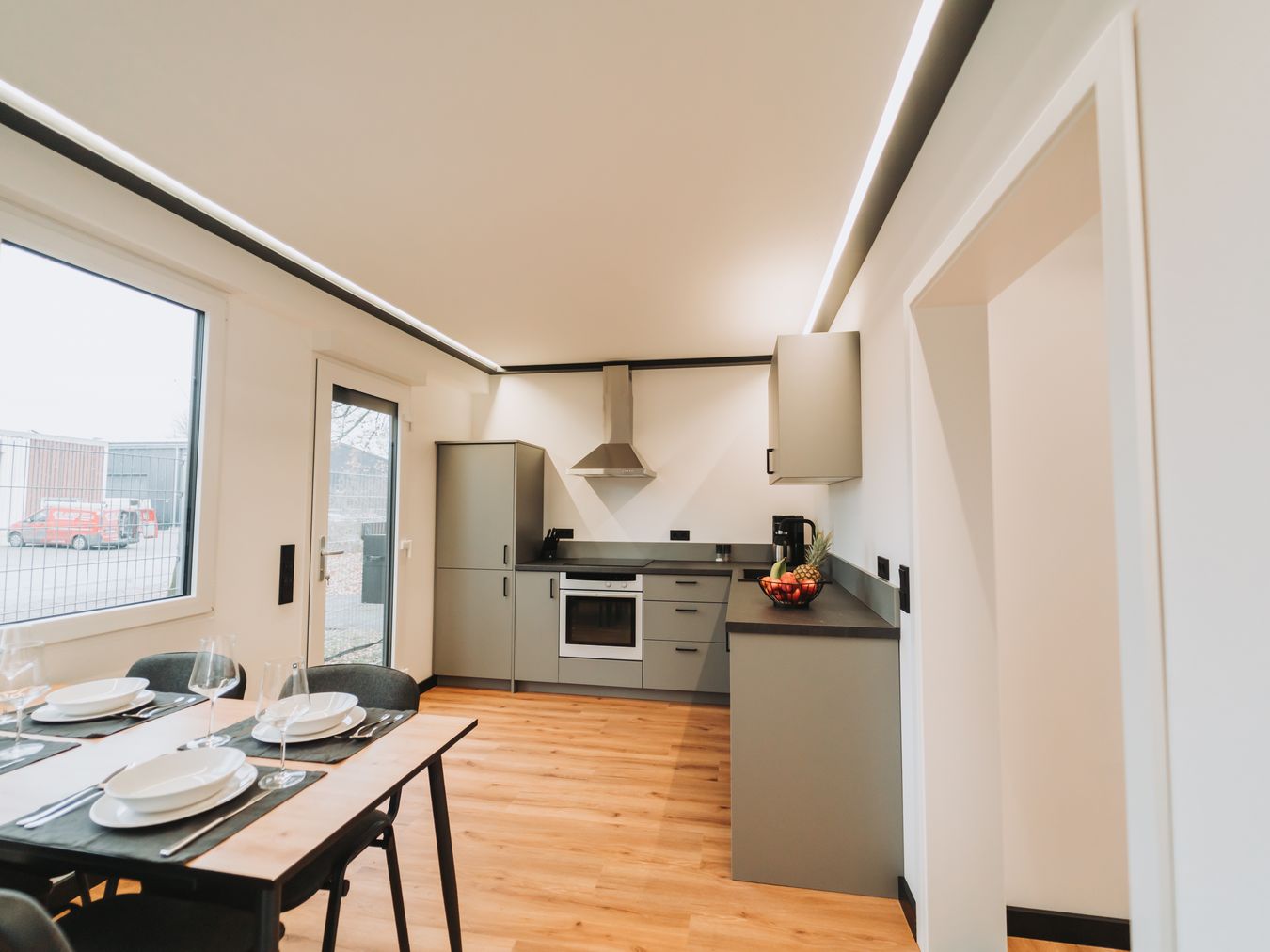 2 Container à 3,00 x 4,87 m: hier findest du ein komfortables Schlafzimmer und eine voll ausgestattete Küche